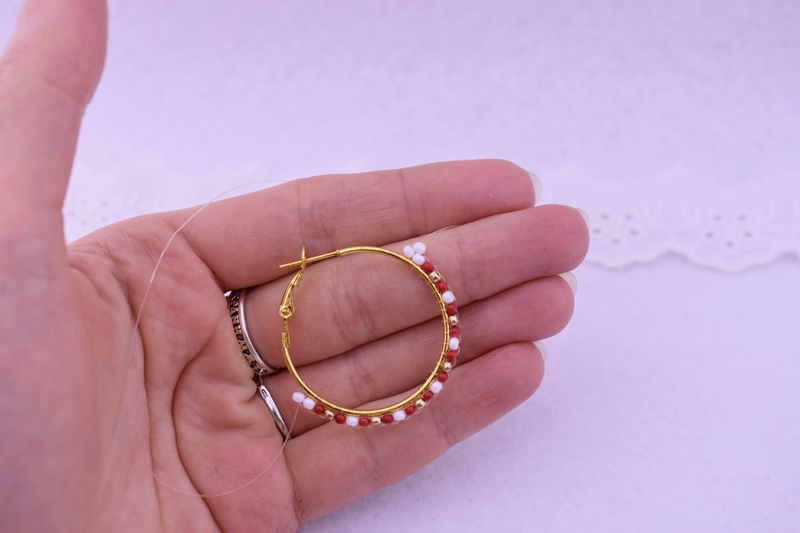 Далее нанизываем в таком порядке: 2 красные бисерины, 2 белые. Повторяем так 6 раз.